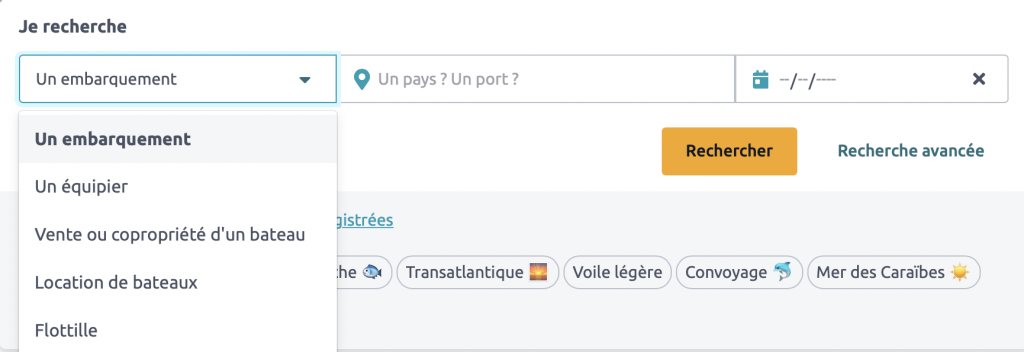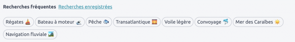 Immédiatement sous le moteur de recherche principal, figurent des boutons vous permettant de consulter les résultats des recherches populaires des membres de VogAvecMoi : Transatlantique, Voile légère, régates, bateau à moteur, pêche en mer…
