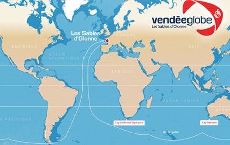 Le Vendée Globe est une course au parcours simplissime : Départ et arrivée aux Sables D’olonne en Vendée (85), entre la ligne de départ et d’arrivée, un tour du monde sans escale d’environ 25.000 milles (soit environ 40.000km), en solitaire, sans escale et sans assistance.