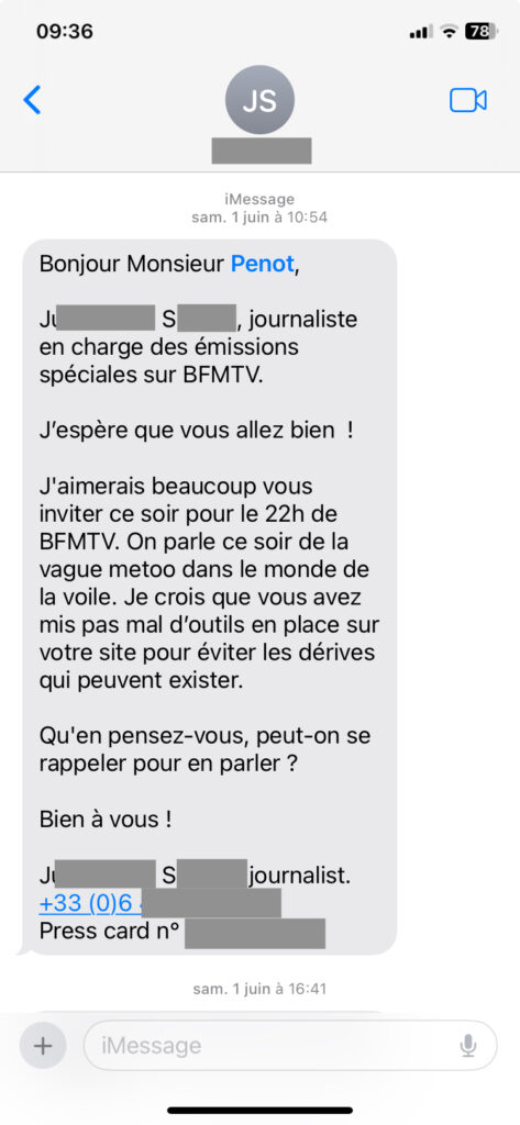 Samedi 1er juin 2024, je reçois (Antoine co-fondateur de Vogavecmoi.com) un message d’un journaliste de BFMTV. Le voici :