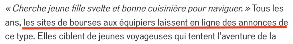 A cause de ce manque de précision, cet article est de nature à décourager toutes femmes d’embarquer sur un bateau ! C’est bien dommage, car le club VOG compte environ 50% de membres « femmes ».