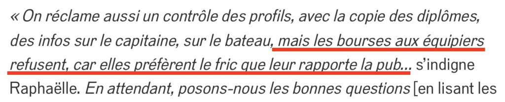 L’article s’offusque qu’aucune prévention, qu’aucun contrôle ne soit exercé par les sites gratuits de bourse aux équipiers gratuits ou les groupes Facebook
