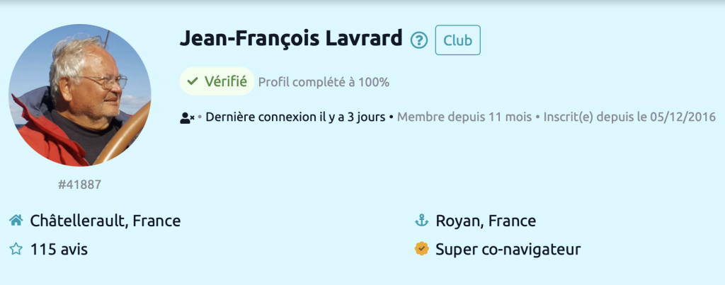 Les supers co-navigateurs se distinguent sur leur profil par le logo . A l’instar de Jean-François, propriétaire d’un Dufour 39DI sur Royan (NDLR : l’homme aux 100 avis !) certains super co-navigateurs sont de véritables supers héros de la co-navigation. Ils ont le super pouvoir de rendre leurs équipiers heureux !