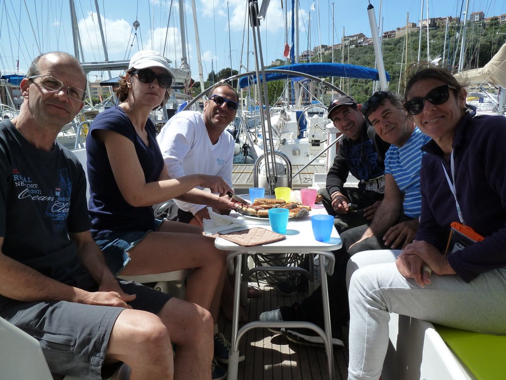 Pour vous dire combien nous sommes « ouverts » dans le Sud, étaient réunis à bord : une Parisienne, une Hyéroise, un Lyonnais, un Hyérois, un Toulonnais, un Marseillais et même un « barde » Breton qui nous gratifiait de chants de marins (sacré Jean-Françoué…). Nous formions une équipe mixte super efficace, avec beaucoup de cohésion. Rien de tel pour la réussite d’une croisière ! Entre le champion du monde de l’apéro ( mon Fréro Sauveur, les « bricole tout », le chargé de l’intendance, de l’organisation, et nos deux équipières, autant actives aux manœuvres de pont qu’à la barre, aux quarts de nuit, à la vaisselle ou à la cuisine, c’était que du bonheur. En plus, il suffisait qu’elles sentent l’odeur du café et du pain frais pour qu’elles émergent de leur cabine tous les matins avec leur plus beau sourire : quoi de mieux pour bien démarrer une journée de navigation?
